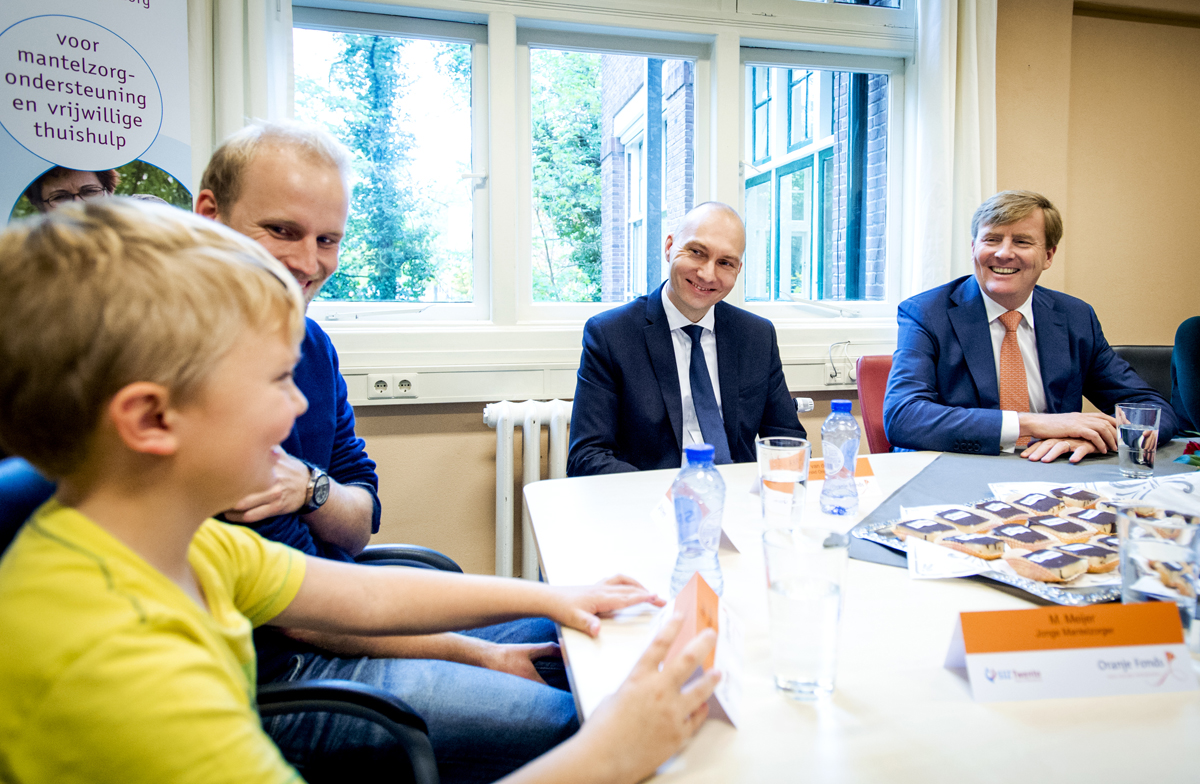 Zijne Majesteit Koning Willem-Alexander ging op 5 november naar Hengelo om te praten met medewerkers van SIZ en met jonge mantelzorgers en hun maatjes. Rens Vossenbeld (23 jaar) weet wat het is om een ouder te hebben die z org nodig heeft. Nu is hij ervaringsmaatje van drie jongens. Een van hen is Tycho Klaver (9 jaar), die de Koning vertelde over zijn vader, die de ziekte van Parkinson heeft en daardoor bijna niet kan lopen. Tycho helpt hem met de dagelijkse dingen: een jas aangeven, koffie brengen, een bordje neerzetten. Als ze samen naar het voetballen gaan, gebruikt Tycho’s vader de scootmobiel. “De Koning vertelde dat zijn vader ook Parkinson had. Dat vond ik het meest bijzonder.”