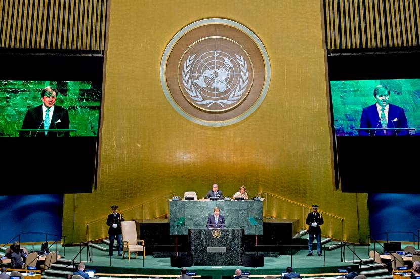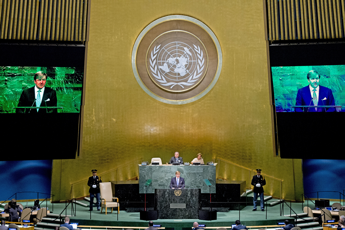 Op 28 september sprak de Koning de Algemene Vergadering van de 193 lidstaten van de VN toe. Het was de eerste keer dat een Nederlands staatshoofd dit deed. De Koning prees de VN als een organisatie die acties op gang brengt die onze wereld mede vormgeven en beter maken. “Hoe zou onze wereld er vandaag hebben uitgezien zonder Verenigde Naties? We zouden zonder twijfel slechter af zijn geweest.” De Koning bedankte de VN voor “zeventig jaar strijd tegen cynisme en fatalisme”. Hij ging daarnaast uitgebreid in op de zorgen die in ons Koninkrijk leven over de internationale situatie. “Grote zorgen maakt ons Koninkrijk zich over de wetteloosheid, de terreur en de minachting voor elementaire mensenrechten die in sommige gebieden terrein winnen. Als gevolg daarvan zijn miljoenen mensen op drift geraakt, wanhopig vluchtend voor het geweld. Zij zijn onschuldige slachtoffers van onverdraagzaamheid en van stuitend opportunisme van machthebbers op wie zij geen greep hebben. Veel vluchtelingen verkeren al te lang in wanhopige omstandigheden. Positieve effecten van jaren van hard werken aan duurzame ontwikkeling dreigen verloren te gaan. Dit gaat ons allen aan. Hierbij kunnen wij onmogelijk de andere kant opkijken.”