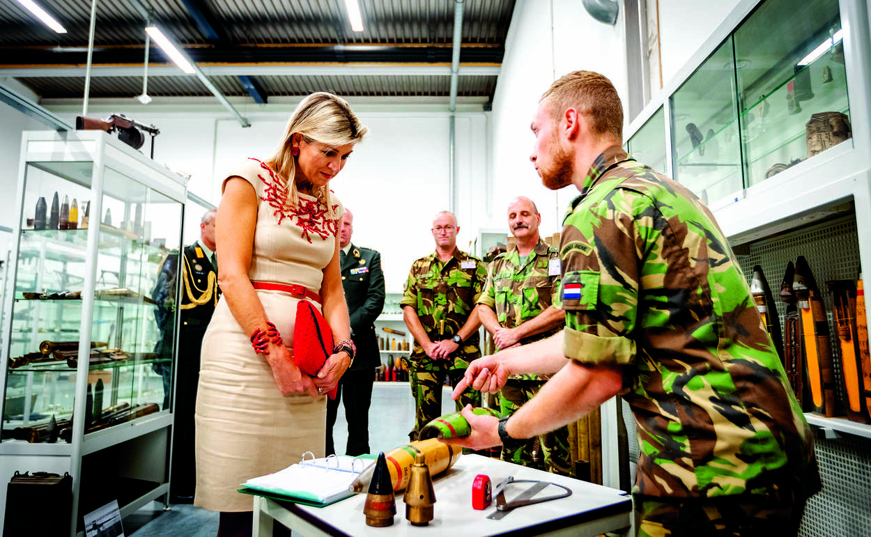 Nog steeds worden er in ons land explosieven uit de Tweede Wereldoorlog gevonden. Elk jaar komen er zo’n tweeduizend meldingen van gevonden granaten binnen. Het onschadelijk maken daarvan is een taak van de Explosieven Opruimingsdienst Defensie (EOD), waar 220 mannen en vrouwen werken. De dienst komt ook in actie bij verdachte pakketjes in de trein, zeemijnen die verstrikt zijn in de netten van vissersboten en zelfgeknutselde vuurwerkbommen. Op 13 september ging Hare Majesteit Koningin Máxima op werkbezoek bij de EOD in Soesterberg om meer te horen over de werkwijze van de dienst. Gewapend met die kennis kon ze ook zelf aan de slag: de Koningin bracht eigenhandig een Britse 25 ponder tot ontploffing. De granaat was afgevuurd in het laatste oorlogsjaar, toen er felle gevechten woedden om het dorp Opheusden.