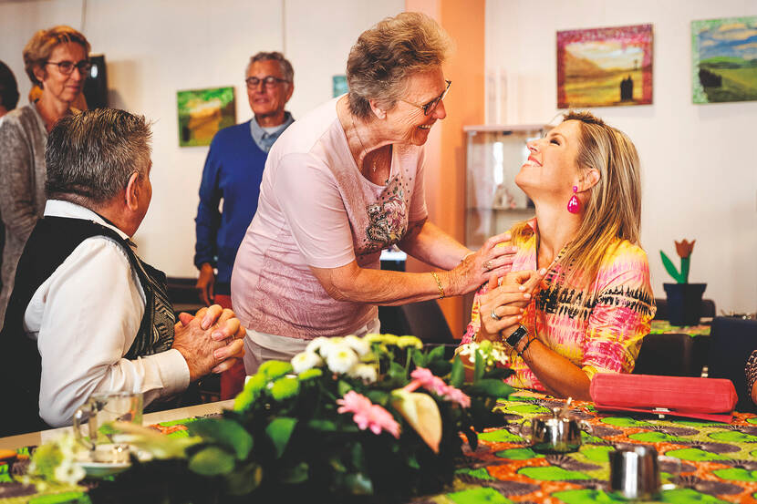 De Koning en Koningin legden samen met 17 kinderen uit Vijfhuizen zonnebloemen bij het gedenkteken. Na de officiële bijeenkomst spraken zij met nabestaanden.