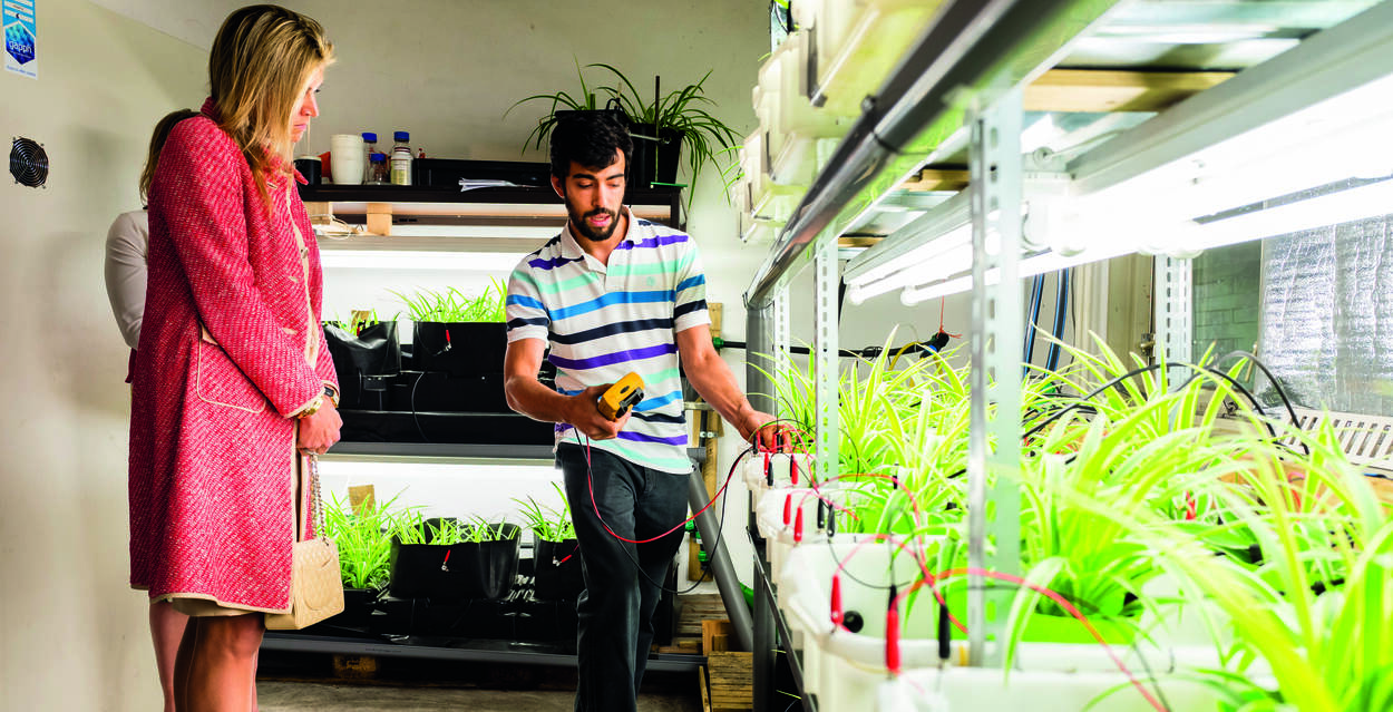 Hare Majesteit Koningin Máxima bracht op 7 juni een werkbezoek aan Plant-e. Zij sprak met medewerkers over de toepassingsmogelijkheden van deze technologie en kreeg een rondleiding. Concrete toepassingen waarmee inmiddels geëxperimenteerd wordt, zijn een verkeerstelsysteem bij Kockengen aangedreven door bermplanten en een ‘living light’ dat gaat branden als je de bladeren aanraakt. “De Koningin was heel enthousiast”, aldus Marjolein Helder, die de Koningin eerder ontmoette tijdens het World Economic Forum in Davos. “We hebben elkaar daar gesproken en de Koningin was uitermate geïnteresseerd in het bedrijf. Dus toen hebben we haar uitgenodigd om een keer te komen kijken. We hebben echt een ontzettend leuke ochtend gehad.”