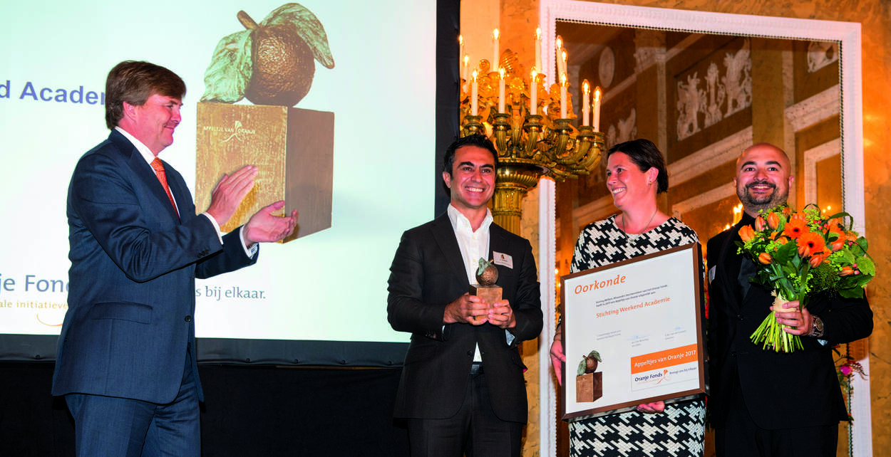 “Veel kinderen starten op school met een 2-0 achterstand omdat ze van huis uit de Nederlandse taal niet meekrijgen. Wij bieden taalondersteuning aan kinderen omdat ze die hard nodig hebben en werken met gastdocenten uit alle hoeken van de maatschappij zodat de kinderen hun horizon kunnen verbreden.” Zo vatte Oguz Dulkadir, directeur van Stichting Weekend Academie, het belang van zijn organisatie samen toen hij op 18 mei op Paleis Noordeinde een Appeltje van Oranje in ontvangst nam uit handen van Zijne Majesteit Koning Willem-Alexander. Ook Ervaringsmaatjes van Stichting Informele Zorg Twente en Stichting Buurtgezinnen.nl ontvingen een Appeltje.