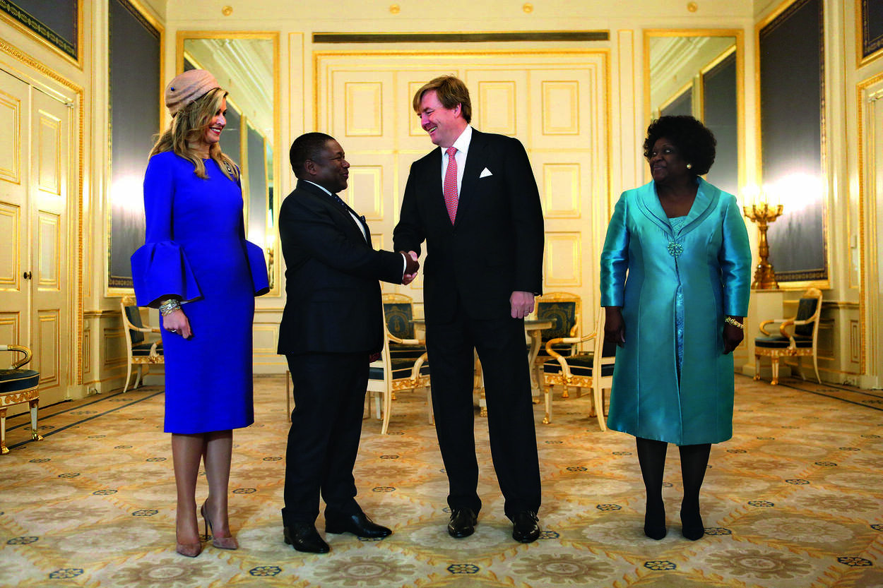 Zijne Majesteit Koning Willem-Alexander en Hare Majesteit Koningin Máxima ontvingen de president en zijn vrouw op 19 mei. Zij spraken uitgebreid met hen en boden hen vervolgens een lunch aan. “Mozambique heeft nu een historische kans op een betere toekomst”, zei de Koning. “Moeder Natuur heeft Uw land gezegend met natuurlijke hulpbronnen die een solide basis kunnen leggen onder ontwikkeling en welvaart. De belangrijkste vraag is hoe alle inwoners van Mozambique van de kansen kunnen profiteren, zodat toekomstige groei iedereen ten goede komt.” De Koning maakte duidelijk dat Nederland heel graag kennis en praktijkervaring met Mozambique blijft delen.