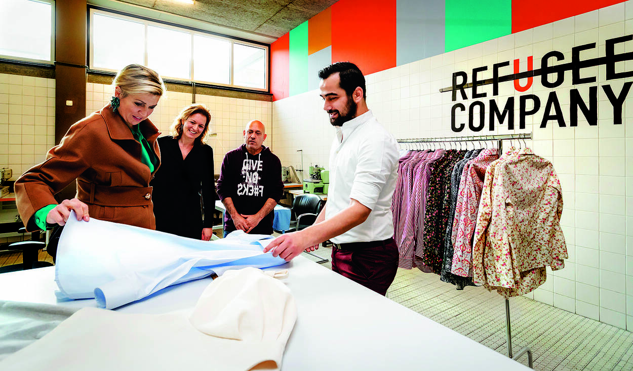 De Koningin bezocht ook het modeatelier, waar zij Mahmoud Al Omar ontmoette. Hij komt uit Syrië en heeft mede dankzij Refugee Company inmiddels een baan bij Suit Supply. “Ik wilde graag werken. Mijn vader heeft me vroeger het kleermakersvak geleerd. Via de gemeente kwam ik terecht bij Refugee Company, waar ik aan de slag kon in het atelier.” In het atelier ontwikkelde hij samen met zijn collega’s een collectie maatoverhemden, die hij enthousiast aan de Koningin presenteerde.