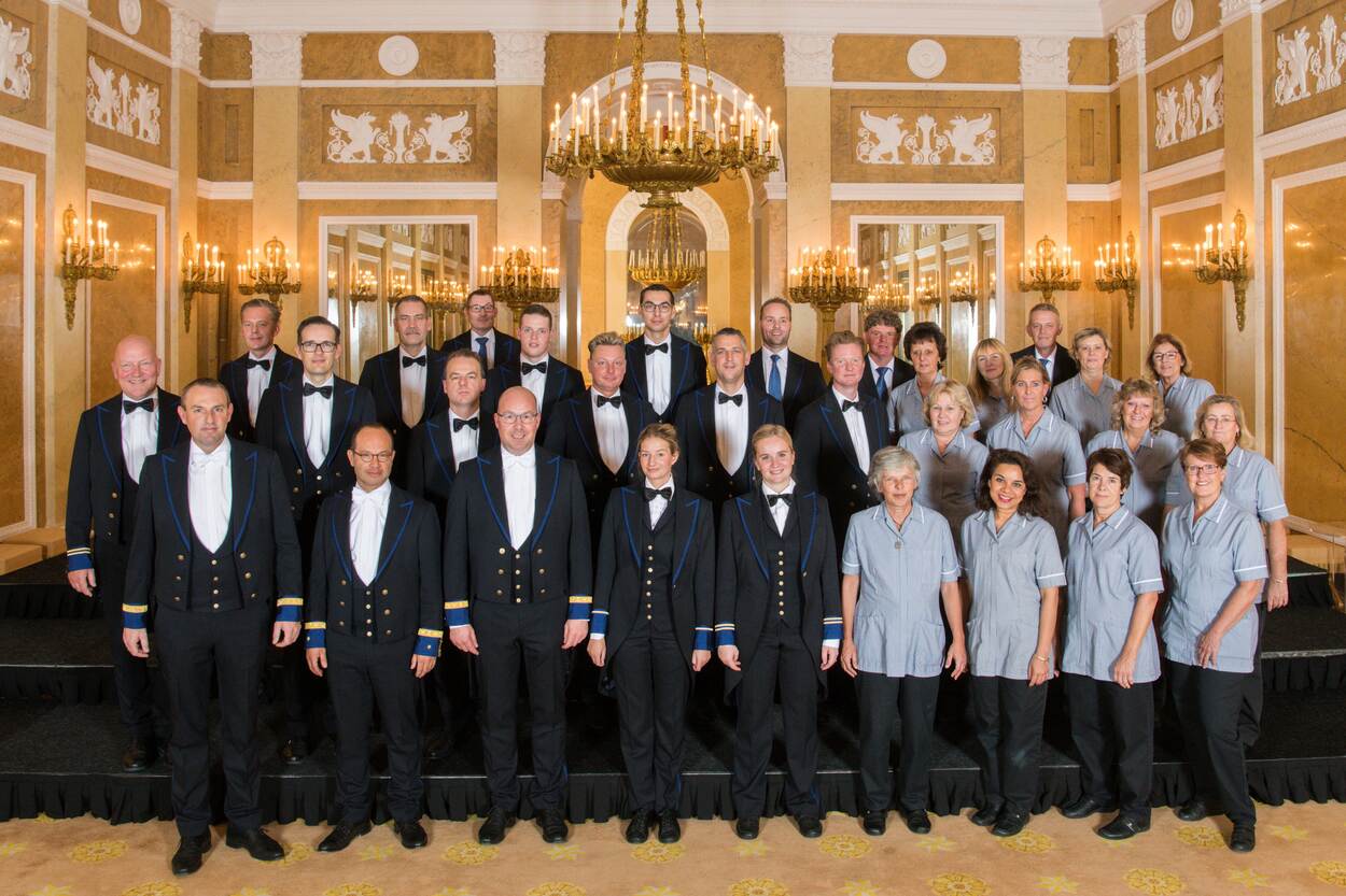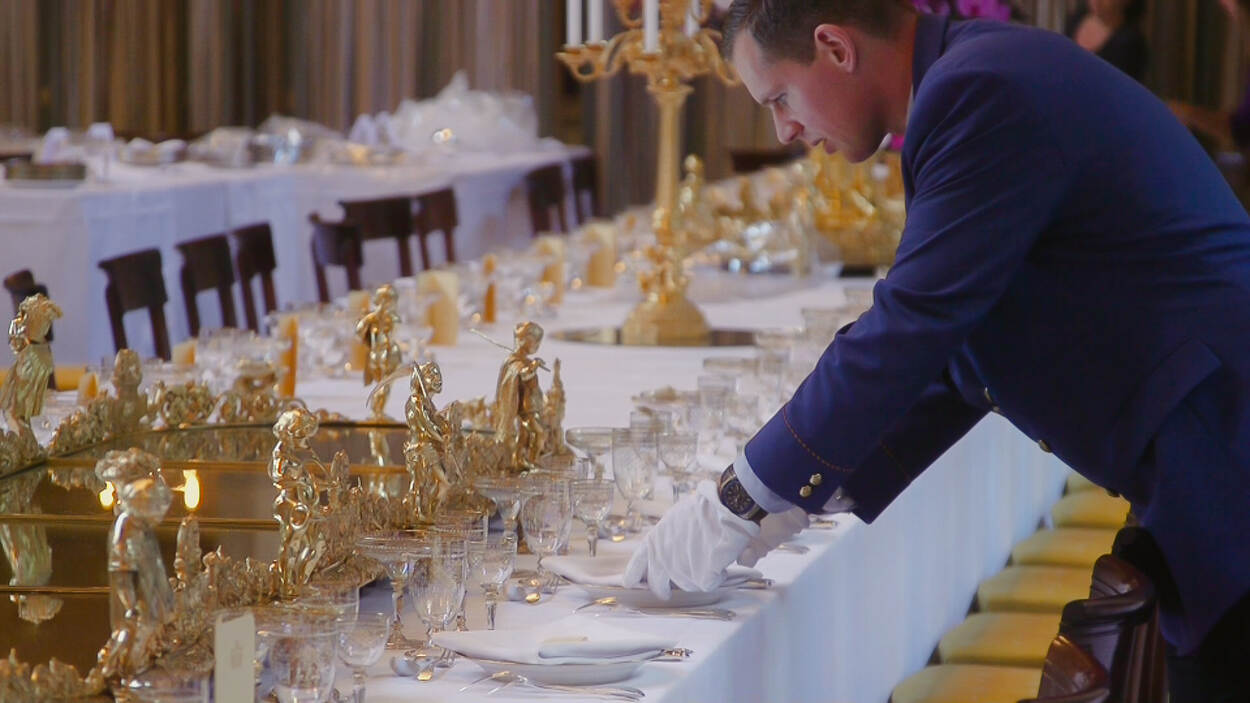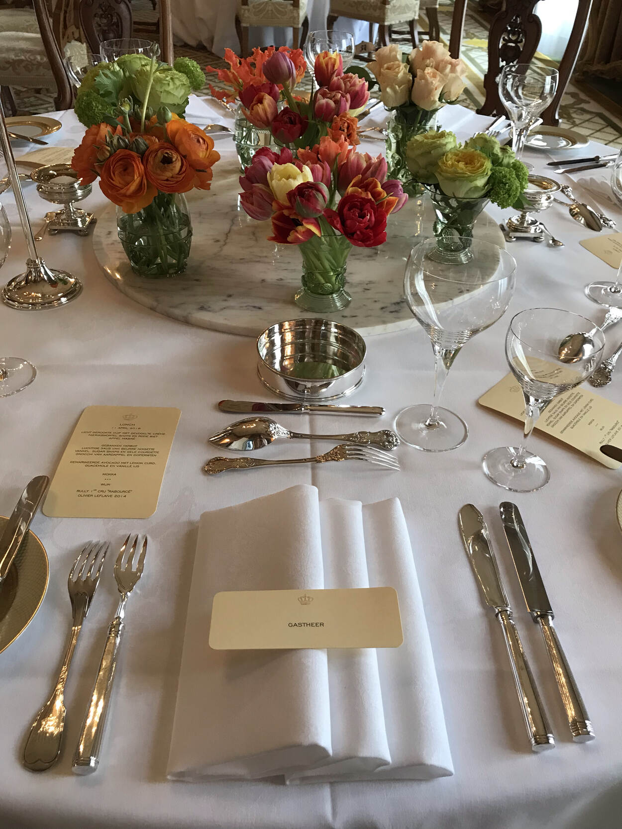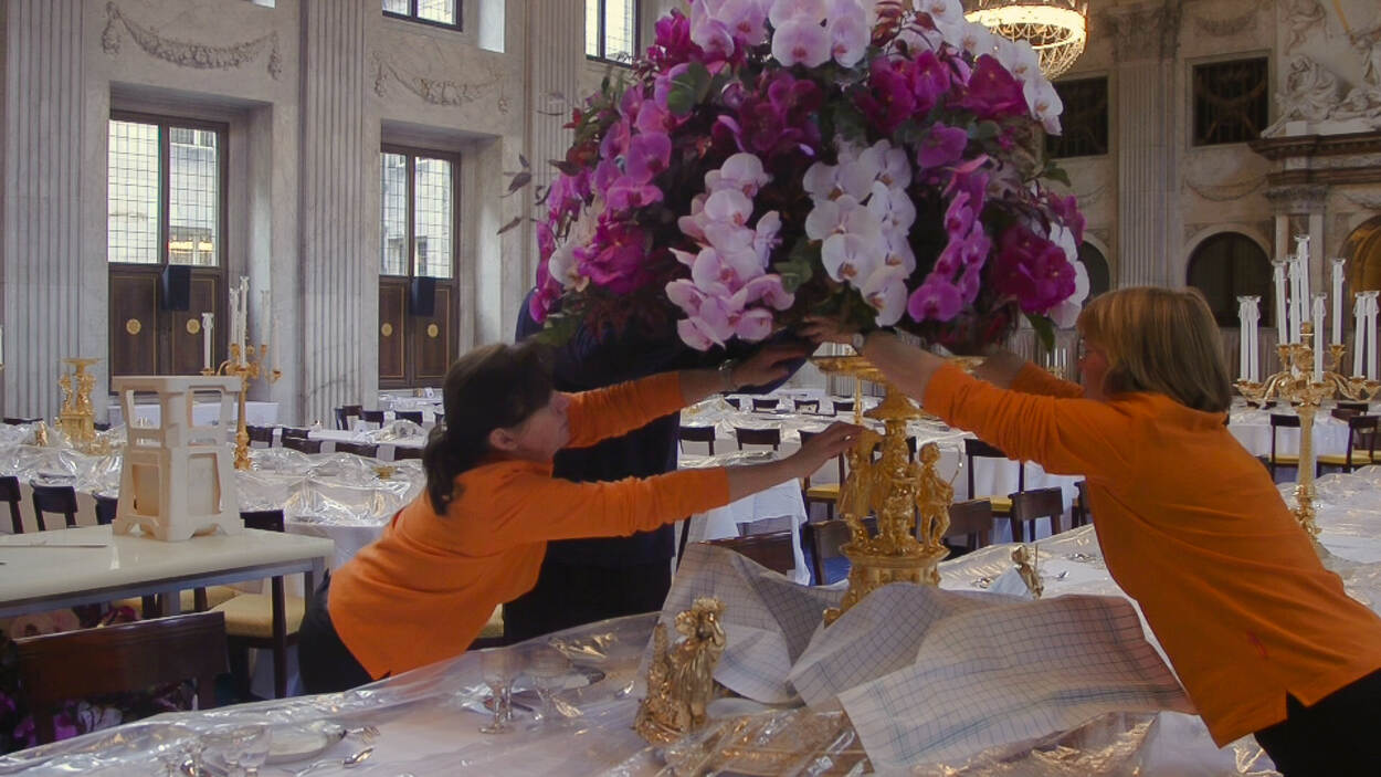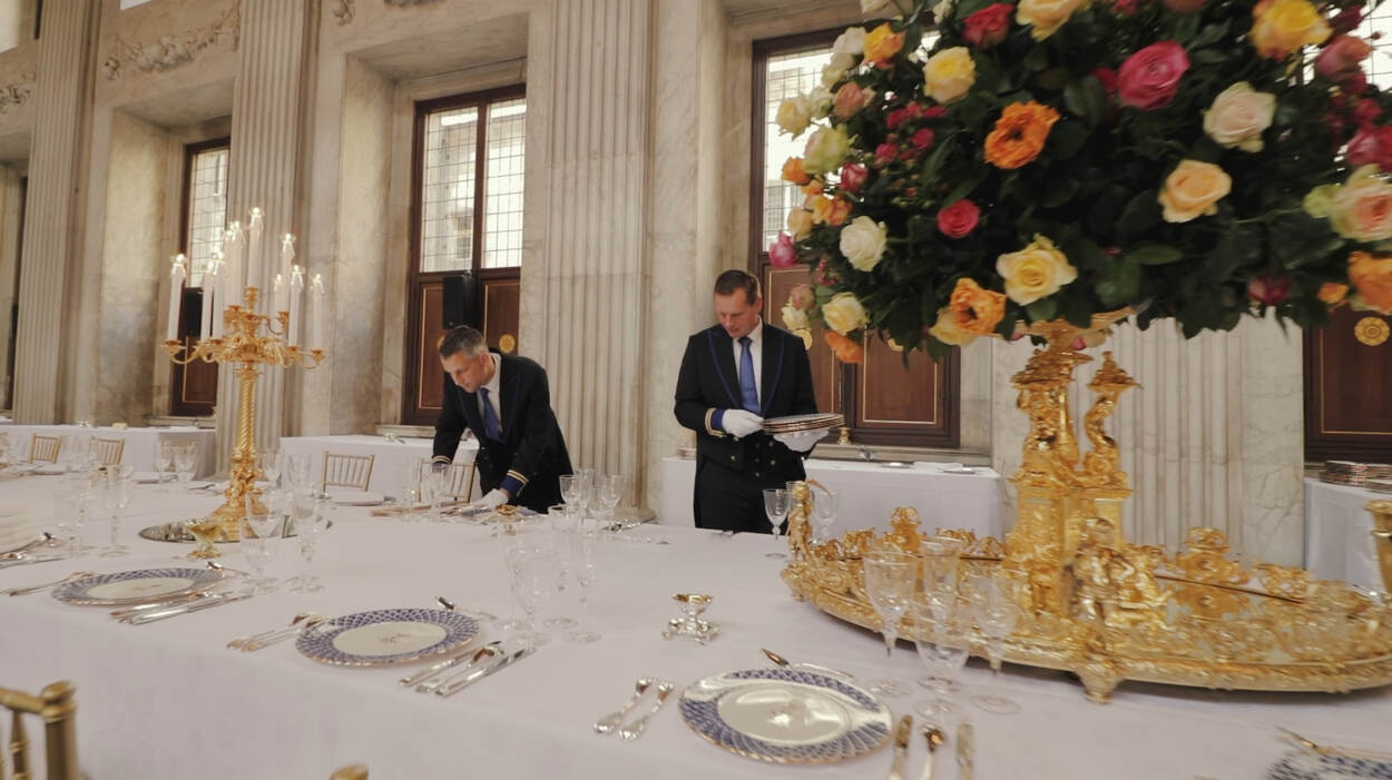Verschillende afdelingen werken volgens een strak protocol samen bij het dekken van de tafels. Dit gebeurt uiterst precies. Medewerkers van de Garderobe en Linnenkamer zorgen voor de tafelkleden en vouwen de servetten. Hun collega’s die over het servies gaan, meten de exacte positie van borden, glazen en bestek uit en zorgen ervoor dat tussen alle gedekte plaatsen een gelijke ruimte zit. De naambordjes worden geplaatst en de specialisten van de Bloemenkamer verdelen verse bloemstukken evenredig over de tafels. Speciale ornamenten, waaronder kandelaars, schalen en vazen worden door de Zilverkamer op de tafels geplaatst.