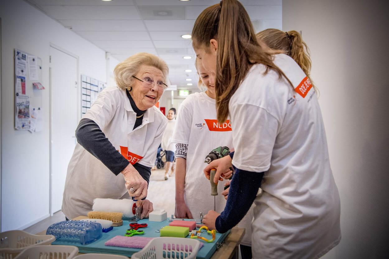 Hare Koninklijke Hoogheid Prinses Beatrix koos voor Kinderdagcentrum Onder één Dak in Amersfoort. Onder de vrijwilligers met wie zij daar aan de slag ging, waren ook Hunne Hoogheden Prins Bernhard en Prinses Annette. Zij hielpen met het maken van leer- en speelmaterialen en het lenteklaar maken van de tuin. Onder één Dak is een plek voor kinderen en jongeren van 4 tot 18 jaar met een verstandelijke beperking. Veel van hen hebben een stoornis in het autismespectrum, soms gecombineerd met gedragsproblemen. Speelgoed waar zij iets aan hebben, moet vaak speciaal worden gemaakt, en dit kost veel tijd. Een voorbeeld is een ‘voelbord’ met sponsjes, kwasten en verfrollers. Door te voelen, leren de kinderen hun tastzin te ontwikkelen en verschillende materialen en texturen te onderscheiden. Begeleider Marèl van Willigenburg: “Deze kinderen kunnen niet naar school, om ze toch te stimuleren in hun ontwikkeling bieden we hun graag allerlei activiteiten aan.”