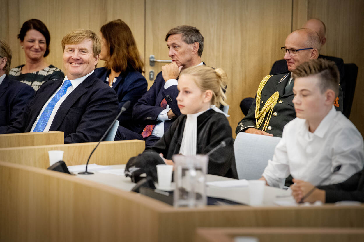 Het thema van de opening was ‘Opvoeding van jongeren in de rechtsstaat en de rol van de instituties hierbij’. De Koning maakte een zitting mee die werd nagespeeld door leerlingen uit de tweede klas van het Stedelijk Gymnasium uit Breda. Manouck Staal (13) zette haar rol als rechtbankvoorzitter overtuigend neer. “Dit is een zitting met een minderjarige. Die zijn normaal gesproken besloten. Maar vandaag is het een bijzondere dag, omdat U hier bent Majesteit ter gelegenheid van de opening van dit gebouw. Daarom wordt deze zitting in het openbaar gehouden.” De verdachte Jelle werd gespeeld door de 13-jarige Teun van Gelderen uit Ulvenhout. Hij had nogal het een en ander op zijn kerfstok: diefstal van Apple-oordopjes, mishandeling van een klasgenoot en het bezit van xtc-pillen. Rechter Manouck had - toen zij aan het slot uitspraak deed en een straf oplegde - nog een moederlijke vermaning voor de jonge delinquent: “Jelle, doe je best, tot ziens…alleen niet hier.”