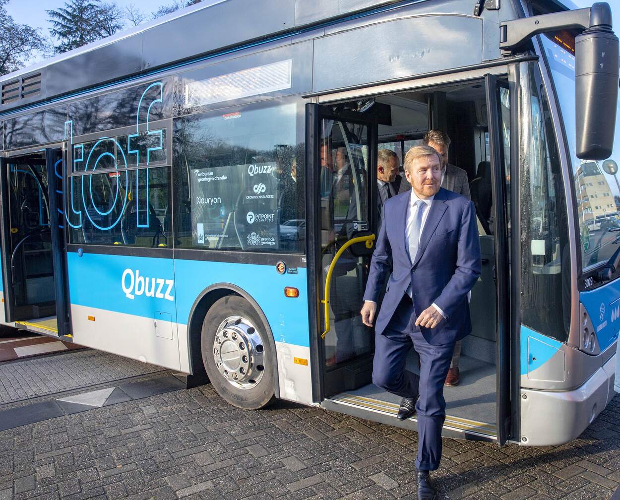Niet alleen in samenwerking, maar ook in duurzaamheid lopen ze voorop in Groningen en Drenthe. Het openbaar busvervoer in de provincies is vanaf december 2019 bijna geheel emissievrij dankzij de inzet van elektrische bussen en streekbussen op waterstof. De Koning maakte een ritje in een waterstofbus door het centrum van Assen en sprak met reizigers, OV-medewerkers en bestuurders over hun ervaringen. “Wat wij doen, bestaat nog nergens anders in Nederland”, aldus Jan Bos, directeur Publiek Vervoer.