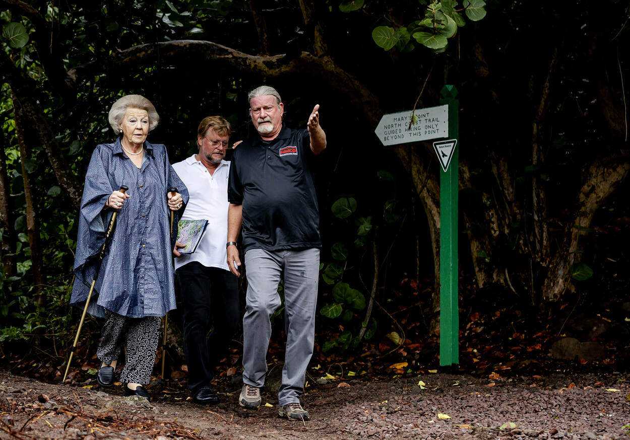 “We gaan wel een stukje verder toch?” Hare Koninklijke Hoogheid Prinses Beatrix zette er op 12 december flink de pas in op het wandelpad Mary’s Point Trail in het nieuwe Mount Scenery Nationaal Park op Saba. De route loopt tot de ruïnes van Mary’s Point, een historische nederzetting uit de zeventiende eeuw. Dankzij de inzet van medewerkers van de Saba Conservation Foundation en van vrijwilligers is het overwoekerde pad weer begaanbaar gemaakt. De Prinses bekrachtigde die prestatie met de onthulling van een informatiebord voor wandelaars.