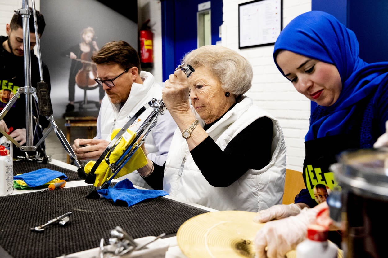 Hare Koninklijke Hoogheid Prinses Beatrix en Zijne Koninklijke Hoogheid Prins Constantijn hielpen samen met Hunne Hoogheden Prins Bernhard en Prinses Annette mee met het sorteren en schoonmaken van muziekinstrumenten bij het magazijn van Stichting Instrumentendepot Leerorkest in Huizen. Jeffry Rampen, coördinator van het Instrumentendepot, keek tevreden naar de geconcentreerd werkende Prins Constantijn: “De Prins is strijkstokken aan het harsen. Als je een ongeharste strijkstok op een viool zet dan krijg je er geen geluid uit. Alleen met hars kan er een mooi geluid uit het instrument komen.”