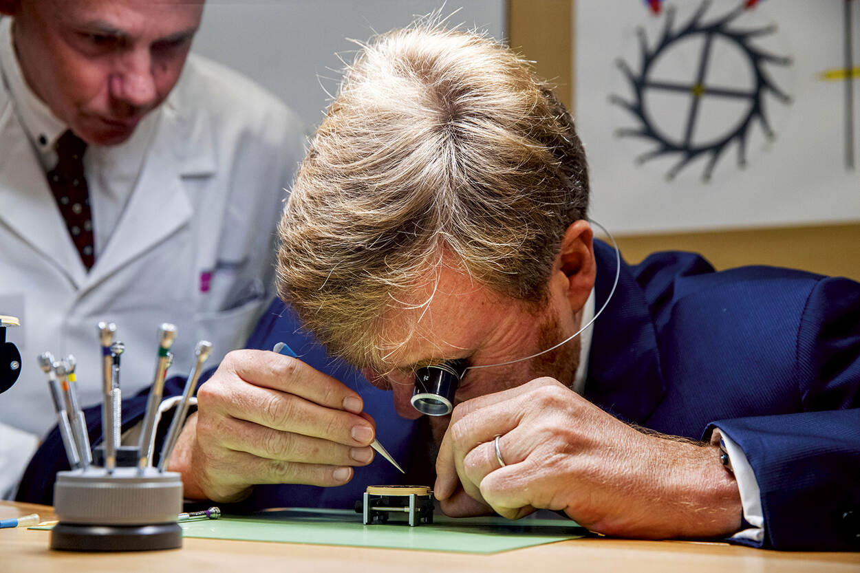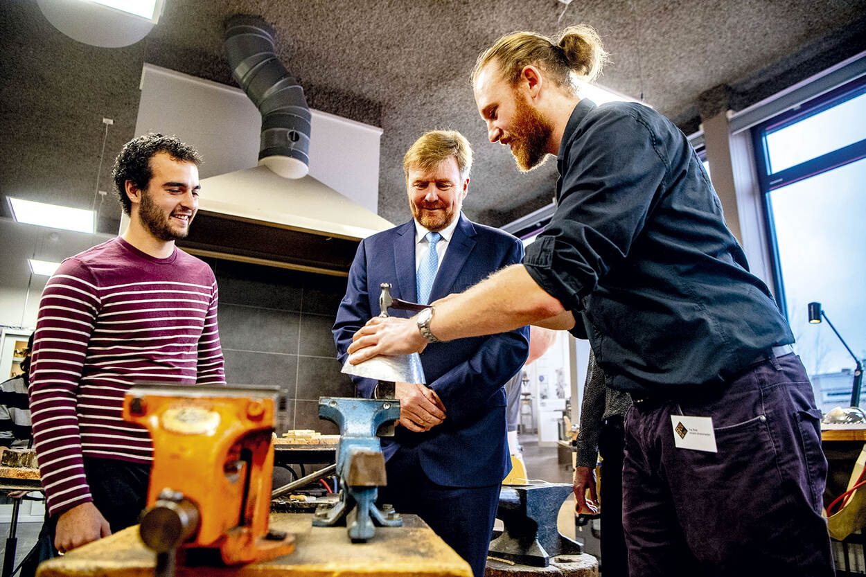 Ter gelegenheid van het 125-jarig bestaan van de vakschool, kwam Zijne Majesteit Koning Willem- Alexander op 14 januari naar Schoonhoven om het jubileumjaar te openen. Als openingshandeling onthulde hij zijn eigen portret, getekend in tekst door student Uurwerktechniek Ruben van Rumpt. De Koning kreeg een uitgebreide rondleiding en praatte in de vaklokalen met studenten, docenten en ondernemers over hun ervaringen. Teun Schraven, student zilversmid, liet de Koning kennismaken met de techniek van het planeren: “Dat is de laatste stap in de afwerking, de laatste hamerslagen op het object om het materiaal op spanning te brengen. Daardoor ontstaat een mooie strakke vorm.” De Koning mocht het geleerde direct in praktijk brengen bij een zilveren beker. Teun toonde zich tevreden over de leercurve van zijn pupil: “Hij deed het goed. Ik heb het object horen zingen en dat is een goed teken.”