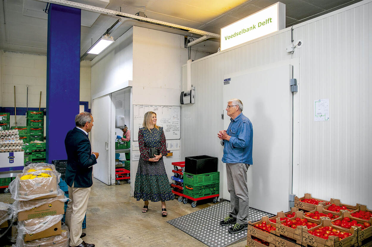 “Normaal daalt het aantal klanten in deze tijd van het jaar door de toename van seizoenswerk. Nu dat werk stilligt, zien we een groei van onze klanten met 5 procent. Ik verwacht dat de vraag de komende maanden nog zal toenemen, vooral van ZZP’ers en flexwerkers.” Peter Vogelaar, voorzitter van het bestuur van de Voedselbank Delft, leidde op 19 mei Hare Majesteit Koning Máxima rond door het distributiecentrum van zijn organisatie en vertelde haar over de impact van de coronacrisis op mensen met onregelmatige inkomsten. Zonder de Voedselbank zouden velen het niet redden. De Koningin bracht een werkbezoek aan de Voedselbank om meer te horen over de praktijk van de voedselhulp in coronatijd. Peter Vogelaar: “Het sociale aspect hebben we moeten schrappen. Een kopje koffie, even bijkletsen, dat kan nu niet. Het levert te veel risico op.” Van de mensen in financiële nood wordt 40 procent niet bereikt door de Voedselbank. De Koningin wilde weten wat er gebeurt om deze mensen toch in het vizier te kr ijgen. Het is immers belangrijk zo snel mogelijk contact te leggen om te voorkomen dat schulden mensen boven het hoofd groeien. Wethouder Karin Schrederhof, één van de gesprekspartners tijdens het bezoek, onderkende dat: “We moeten mensen zo snel mogelijk helpen om uit de schulden te komen. Daarom werken we als gemeente nauw samen met de Voedselbank, woningcorporaties, energiemaatschappijen en zorgverzekeraars.”