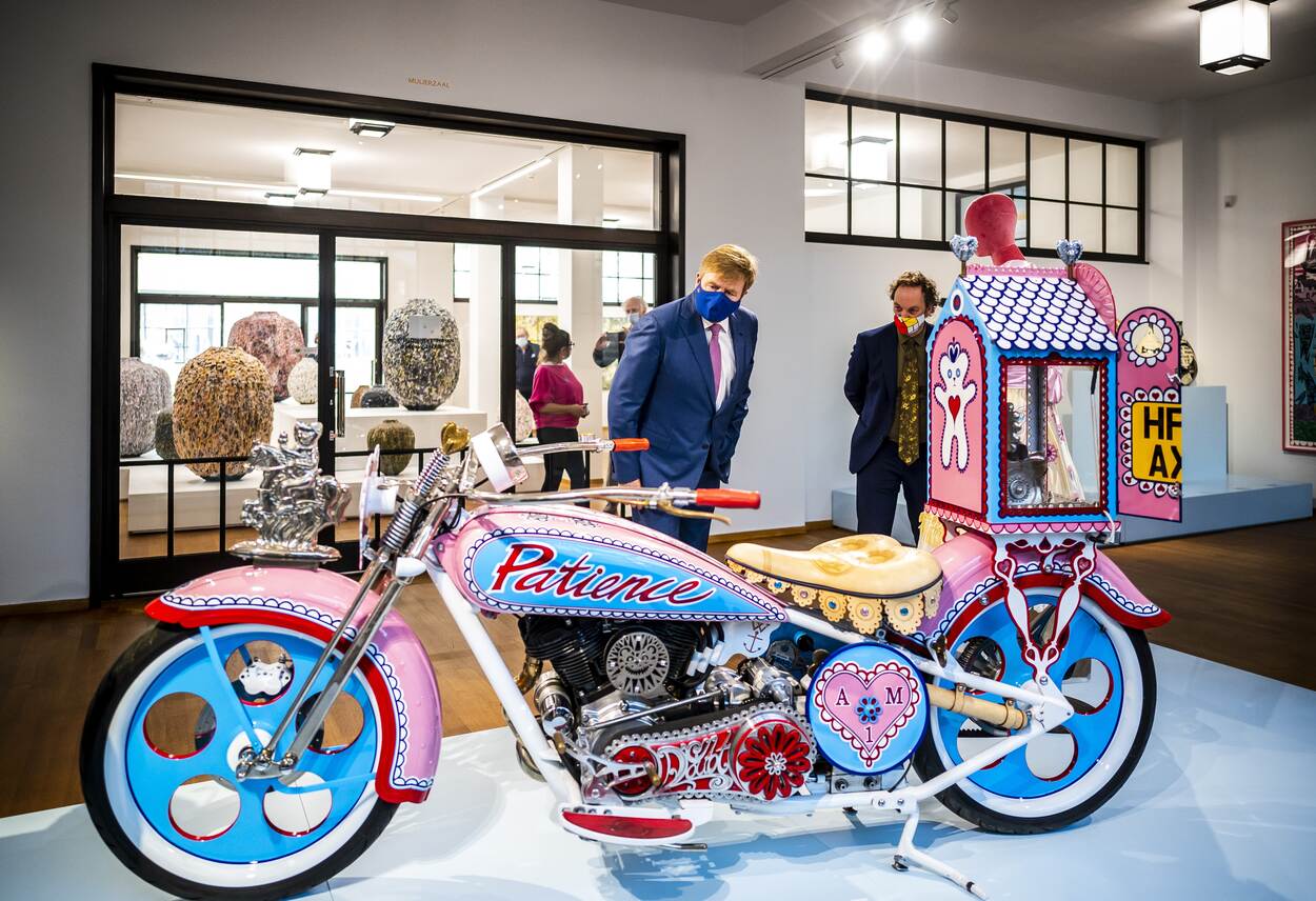 Grayson Perry is een kunstenaar die de verbinding zoekt met een breed publiek. Zijn werk is speels en kleurrijk en omvat de meest uiteenlopende objecten: vazen, wandkleden, houtsneden, sculpturen, jurken en zelfs een uitbundig versierde motorfiets. Grayson Perry verzet zich tegen het hokjesdenken in de kunst en de samenleving en laat zien dat ieder mens een gelaagde identiteit heeft. Hij noemt zich een pottenbakkende travestiet en verkleedt zich graag als zijn alter ego Claire. Met zijn tv-programma ‘Grayson’s Art Club’ enthousiasmeert hij de meest uiteenlopende mensen om thuis creatief aan de slag te gaan. “Veel mensen voelen zich geïntimideerd door zogenoemde hoge kunst”, vertelde hij de Koning. “Ik wil mensen die nooit naar musea gaan het vertrouwen geven dat hun mening ertoe doet."