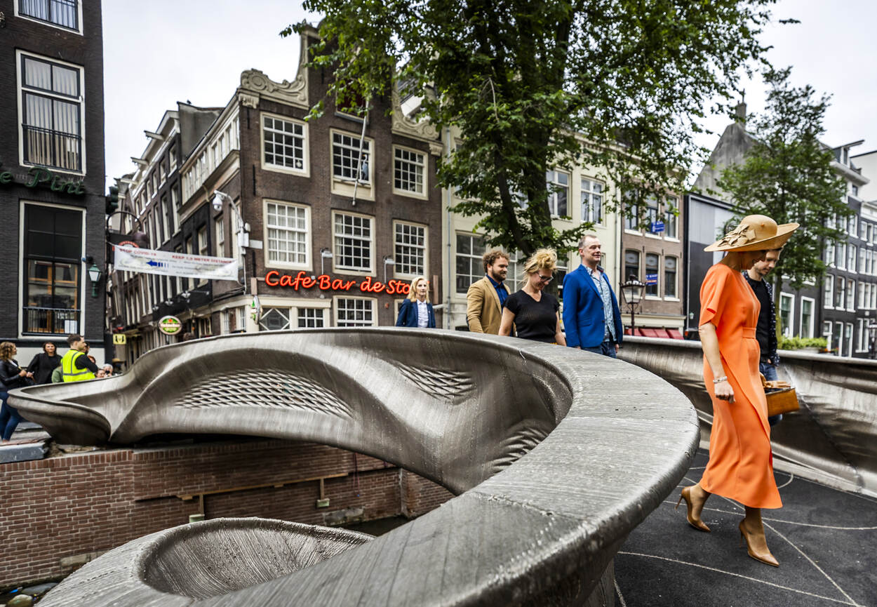 “Wij proberen altijd grenzen te verleggen met nieuwe technologie en verlangen ernaar in staal grote objecten te printen die efficiënt gebruikt kunnen worden. Een brug over een gracht in Amsterdam is dan een geweldige metafoor. De oude stad wordt verbonden met de technologie van de toekomst.” Toen ontwerper Joris Laarman in 2017 deze woorden schreef, was zijn droom nog toekomstmuziek. Weliswaar was de ontwerp- en experimenteerfase afgerond, het printen en testen van de brug zelf was nog maar net begonnen. Vier jaar later was het dan eindelijk zover dat de eerste 3D-geprinte stalen brug ter wereld geplaatst kon worden aan de Oudezijds Achterburgwal in Amsterdam. Hare Majesteit Koningin Máxima verrichtte de opening op 15 juli. Na de opening sprak zij met de ontwerpers, bouwers, vertegenwoordigers van de gemeente en buurtbewoners.