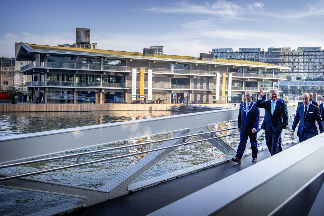 Architect Nanne de Ru leidde de Koning en de andere gasten rond: ”Het gebouw rust op een betonnen drijflichaam. Het beton wordt koud in het Rijnhavenwater en via leidingen wordt daarmee het gebouw gekoeld. Dit klimaatbestendige kantoor kan meedeinen met de klimaatverandering en de waterstijging.”