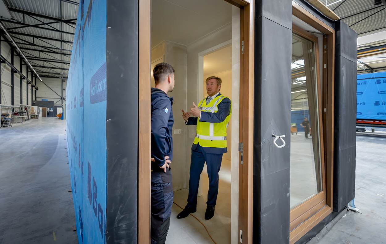 Door te werken met modules die in de fabriek in elkaar worden gezet, wordt heel veel tijd bespaard. Jaarlijks rollen er bij Barli ongeveer achthonderd nieuwe woningen van de band. De Koning keek uitgebreid rond en liet zich door de medewerkers informeren over alle aspecten van het productieproces.