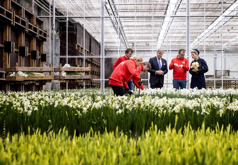 Bij bollenbedrijf W.F. Leenen in Voorhout (gemeente Teylingen) sprak het Koninklijk Paar met vertegenwoordigers uit de bollensector. Simon Pennings, voorzitter van de Kring Bloembollenstreek, vertelde over de ruimtedruk: “Er is zo’n ongelofelijke druk om te bouwen in deze streek. Het is een continu gevecht.”