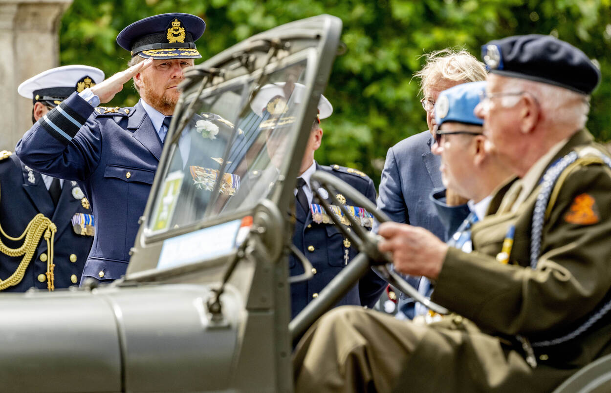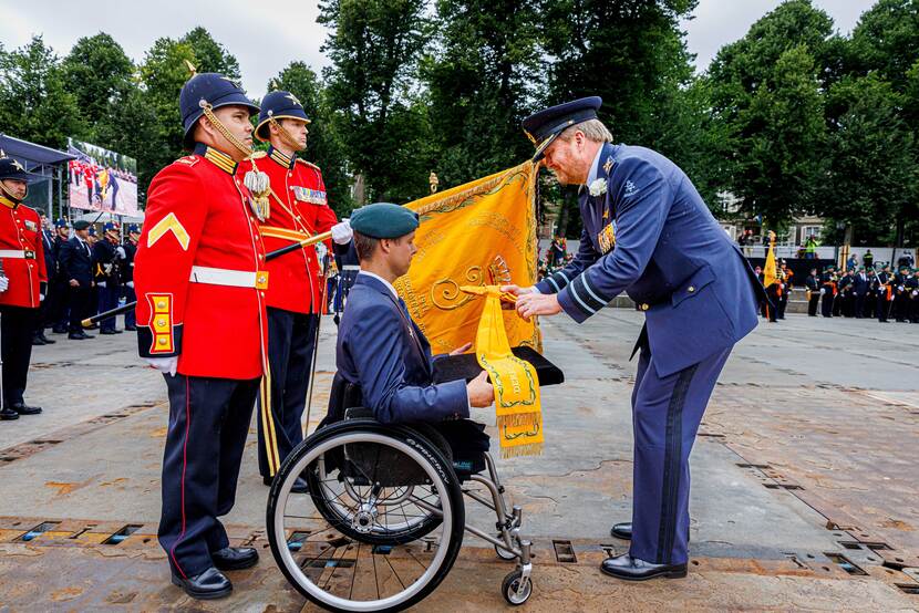 Aansluitend reikte de Koning op pontons op de Hofvijver vaandelopschriften uit aan achttien eenheden van de krijgsmacht die zich tijdens de strijd in Afghanistan hebben onderscheiden. Hij sprak de militairen als volgt toe: “De zaden die u heeft helpen planten in Afghaanse bodem, zullen ooit ontkiemen en vrucht dragen. Daar hopen en vertrouwen wij op. Laten we ons vasthouden aan de les die overste Gijs Tuinman, één van de dragers van de Militaire Willems-Orde, meegeeft aan zijn kinderen: ‘Nooit, maar dan ook nooit opgeven. Hoe slecht de situatie ook is’. Wij voelen ons één met de Nederlandse militairen die zich op dit moment inzetten in Europa en elders in de wereld, samen met onze Europese partners en NAVO-bondgenoten. Zij dragen het schild waarachter wij in vrijheid kunnen ademen en leven. Wij voelen ons evenzeer verbonden met alle ruim 100.000 veteranen die zich vanaf de Tweede Wereldoorlog hebben ingezet in dienst van het Koninkrijk. Uw herinneringen, uw loyaliteit, uw gevoelens, en uw pijn verdienen respect en aandacht. Nu en in de toekomst. Iedere nieuwe generatie kijkt opnieuw naar het verleden en komt op basis van onderzoek met een eigen waardering daarvan. Dat is goed en hoort bij een vrije, democratische rechtsstaat die kritisch is op zichzelf en wil leren van de geschiedenis. Maar een samenleving kan zich nooit losmaken van zijn veteranen. U hoort bij ons. Wij horen bij u. Wij zijn - in lief en leed - één.”