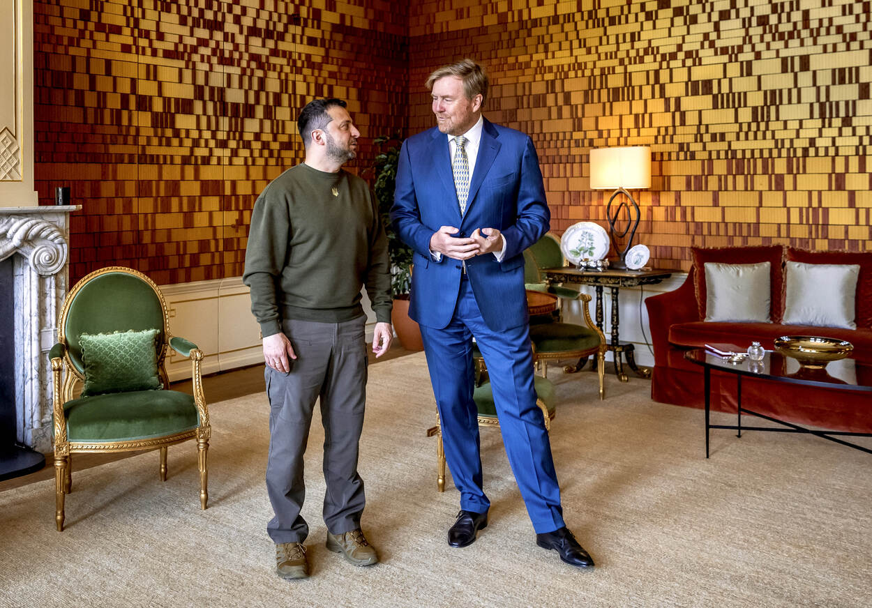 De Koning ontvangt Volodymyr Zelensky, de president van Oekraïne, in audiëntie. De ontvangst vindt plaats op Paleis Huis ten Bosch.
