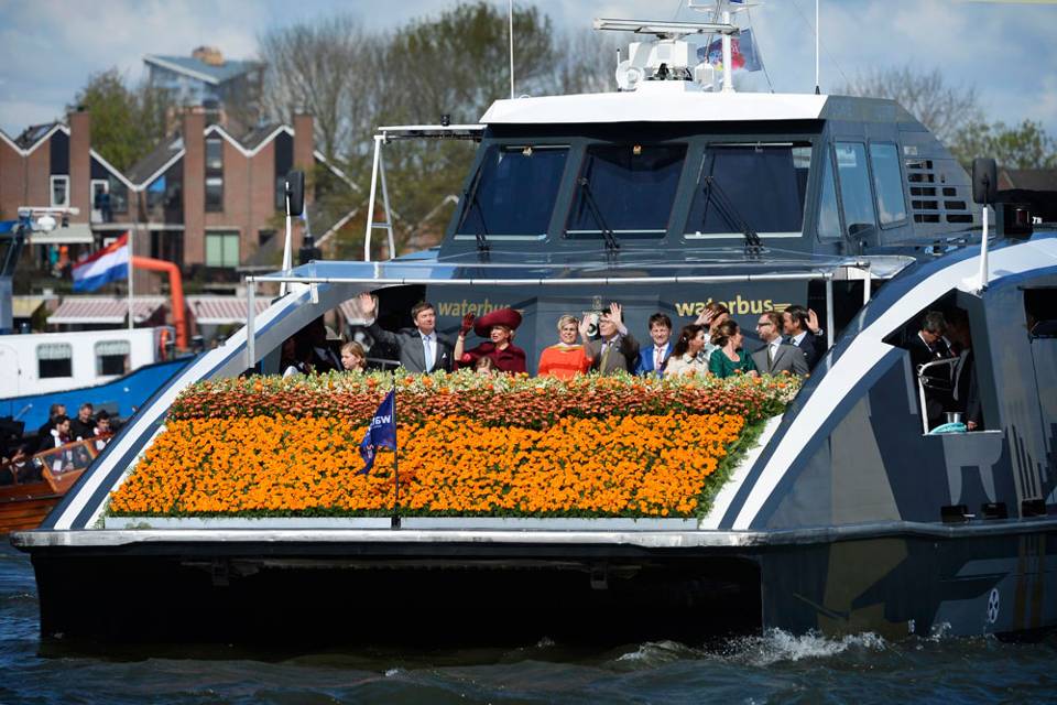 Vergroot afbeeldingDordrecht, 27 april 2015: Het Koninklijk gezelschap vaart met een fluisterboot door de havens van Dordrecht