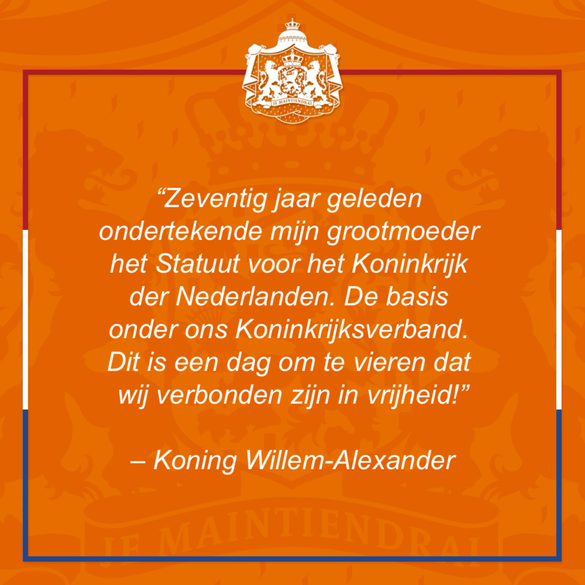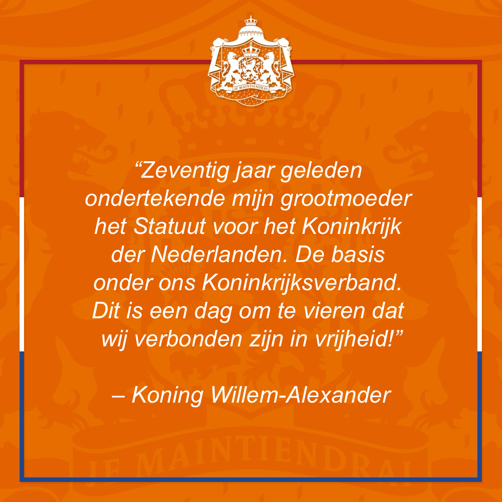 “Zeventig jaar geleden ondertekende mijn grootmoeder het Statuut voor het Koninkrijk der Nederlanden. De basis onder ons Koninkrijksverband. Dit is een dag om te vieren dat wij verbonden zijn in vrijheid!” - Koning Willem-Alexander