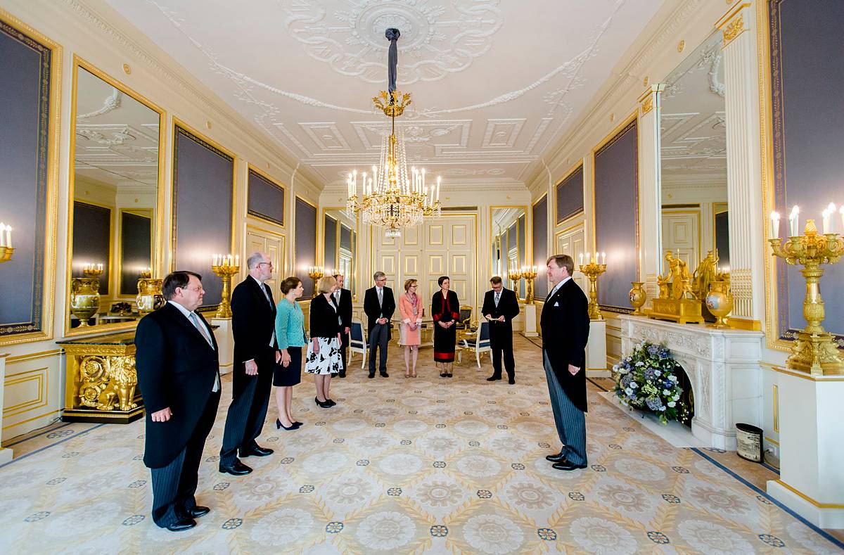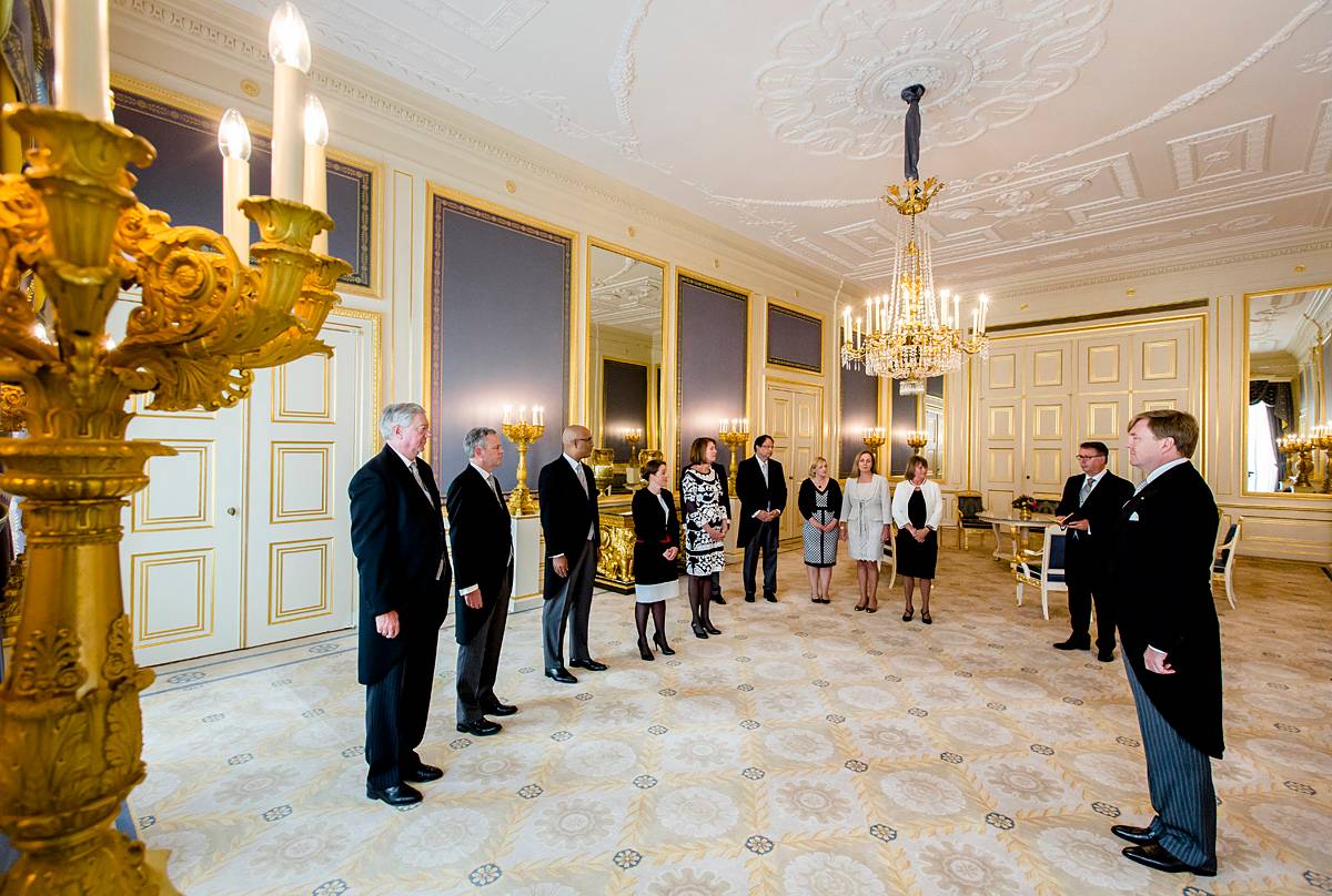 Vergroot afbeeldingKoning Willem-Alexander beëdigt de ambassadeurs in Paleis Noordeinde. Vlnr. de heer Kop (Kazachstan), de heer Strating (Libië), mevrouw Valkenburg-Roelofs (Cuba) en mevrouw Van Stegeren (Estland).