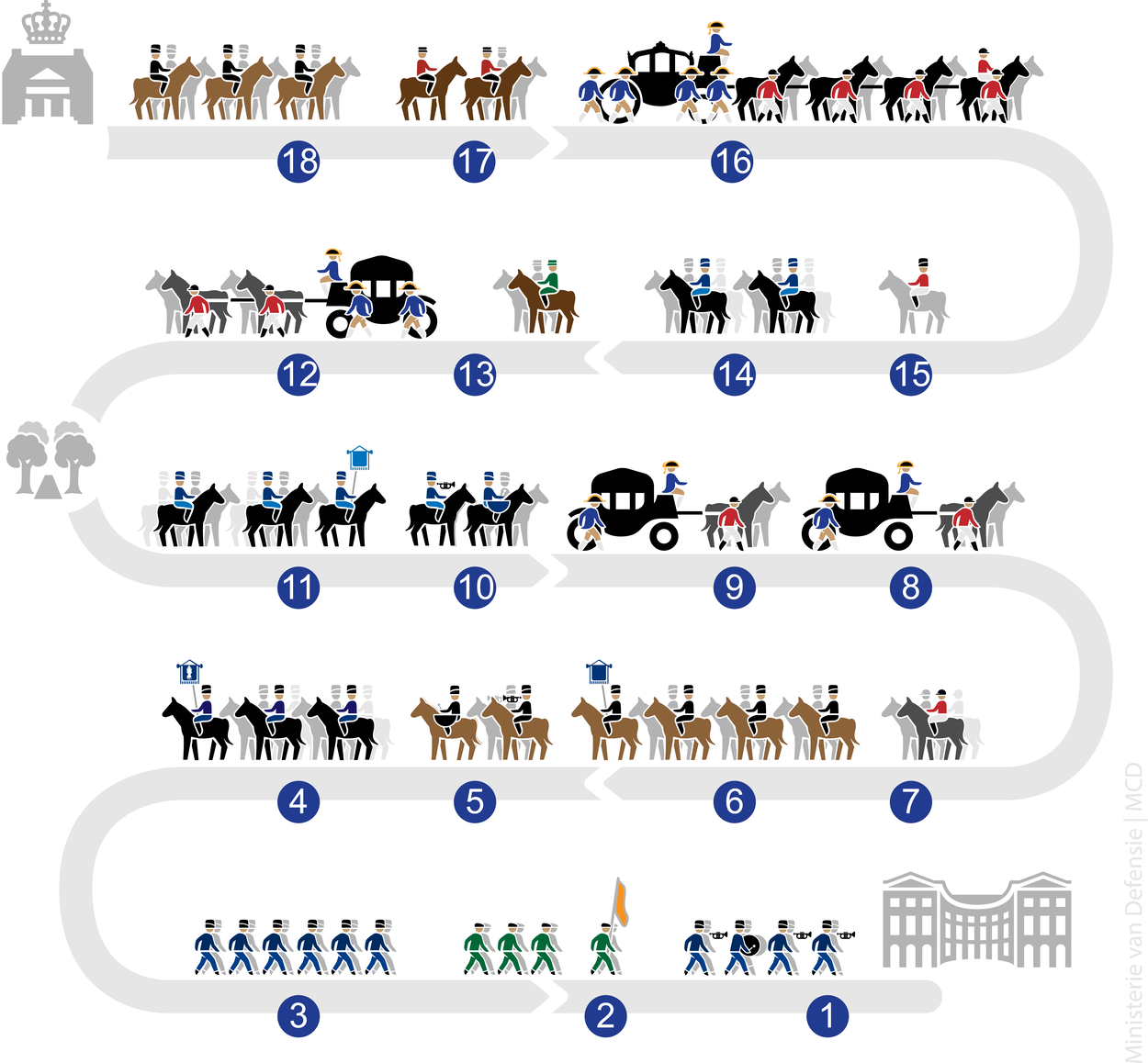 De Koning, Koningin Máxima, de Prinses van Oranje, Prinses Alexia, Prins Constantijn en Prinses Laurentien rijden per koets van Paleis Noordeinde naar de Koninklijke Schouwburg. De Koninklijke stoet bestaat daarnaast uit leden van de hofhouding, politie te paard, een muziekkorps en verschillende regimenten van Defensie.