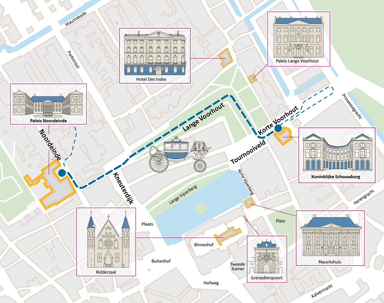 De route van de Koninklijke stoet loopt via Noordeinde, Heulstraat, Kneuterdijk, Lange Voorhout en Tournooiveld naar het Korte Voorhout. De Glazen Koets stopt bij de Koninklijke Schouwburg. De stoet rijdt na het uitspreken van de Troonrede via dezelfde route terug naar Paleis Noordeinde.