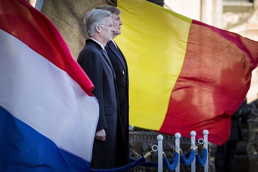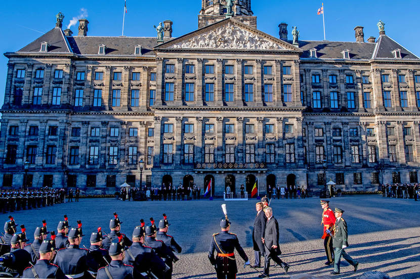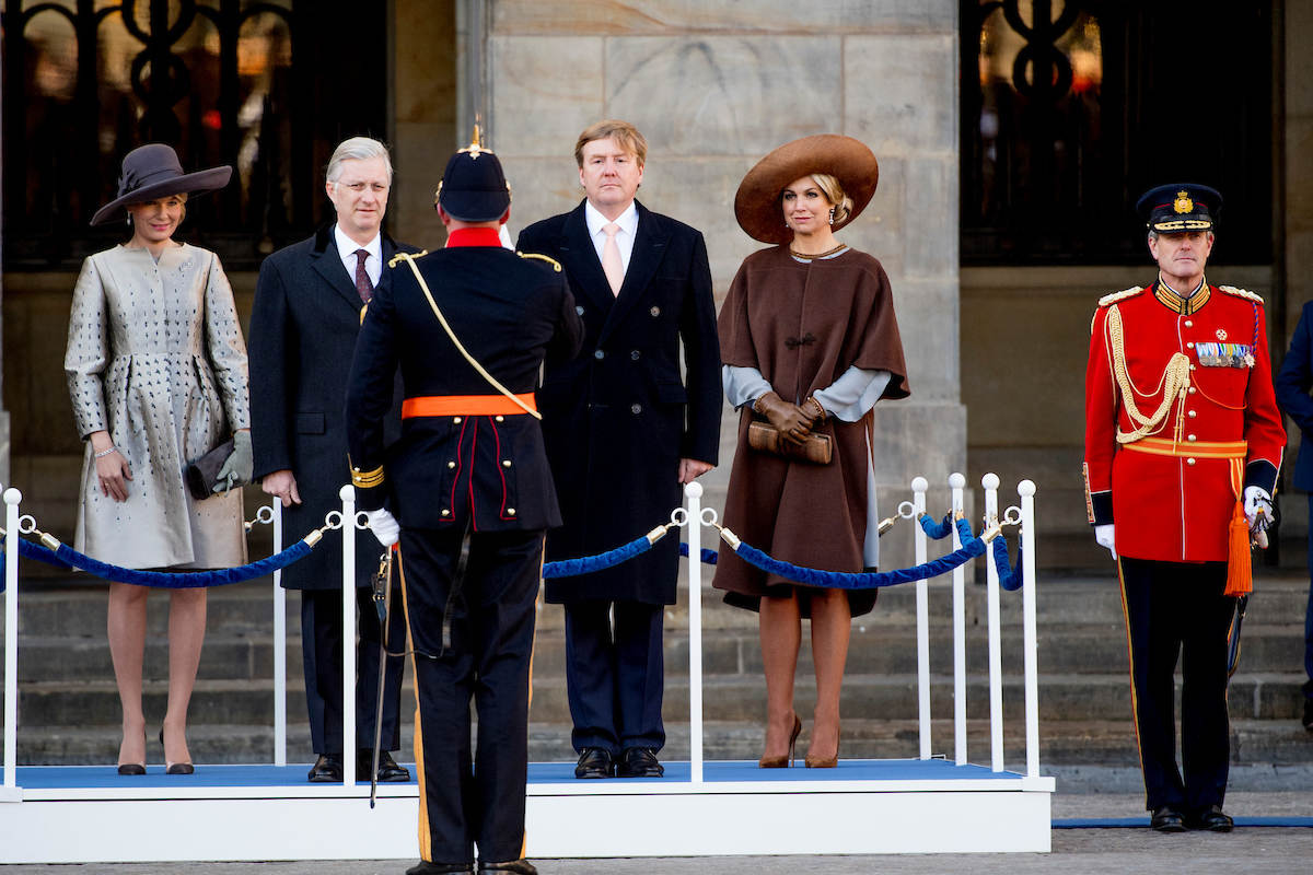 Koning Filip en Koningin Mathilde werden officieel welkom geheten op de Dam in Amsterdam door Koning Willem-Alexander en Koningin Máxima.