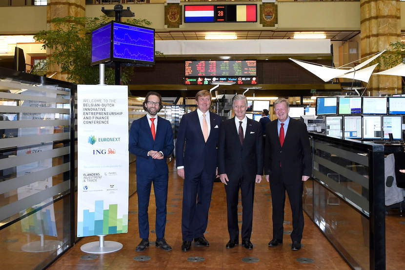 Koning Willem-Alexander en Koning Filip woonden aansluitend bij Euronext Amsterdam de slotconclusies bij van de Belgian-Dutch Innovative Entrepreneurs & Finance Conference.