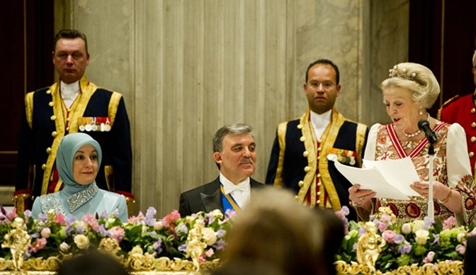 De Koningin verwelkomt president Gül en zijn echtgenote dinsdagochtend bij het Koninklijk Paleis Amsterdam . Na de welkomstceremonie leggen president Gül en zijn echtgenote in aanwezigheid van minister-president Rutte en burgemeester Van der Laan van de gemeente Amsterdam een krans bij het Nationaal Monument op de Dam. 's Middags opent president Gül in het bijzijn van de Koningin, Z.K.H. de Prins van Oranje en H.K.H. Prinses Máxima der Nederlanden in het Amsterdam Museum de tentoonstelling 'De kamer van de Levantse Handel'. De tentoonstelling laat de vroege (handels)geschiedenis zien tussen Nederland en Turkije. Aansluitend ontmoet de president, vergezeld door de Prins van Oranje en Prinses Máxima, in conferentiecentrum De Bazel vertegenwoordigers van het Nederlandse en Turkse bedrijfsleven.