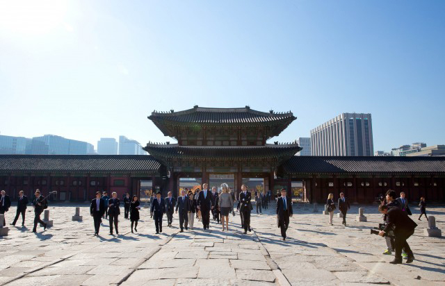 Willem-Alexander en Koningin Máxima een krans leggen bij de Memorial Tower. Aansluitend wordt het Koninklijk Paar officieel verwelkomd door president Park, in Cheong Wa Dae, het presidentiële paleis. Na het welkomstceremonieel en de inspectie van de erewacht, vindt een audiëntie plaats, gevolgd door delegatiebesprekingen.
