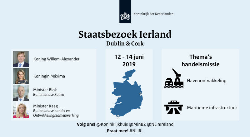 De Koning en Koningin worden bij hun bezoek vergezeld door minister Blok van Buitenlandse Zaken. Minister Kaag voor Buitenlandse Handel en Ontwikkelingssamenwerking leidt gelijktijdig een economische missie naar Ierland om het bestaande potentieel voor economische samenwerking te vergroten. De missie bestaat uit ondernemers uit de sectoren maritieme infrastructuur en havenontwikkeling.