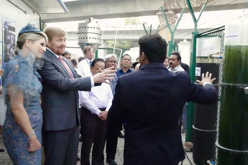 Bij het Barapullah-waterafvoerstelsel sprak het Koninklijk Paar met jonge professionals uit de Nederlandse en Indiase watersector over innovaties in het zuiveren van water.