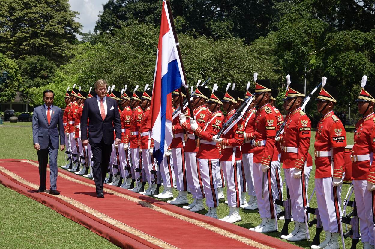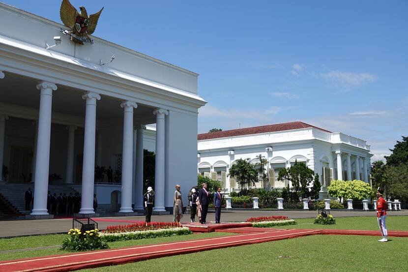 Daarna volgde de officiële welkomstceremonie op het presidentieel Paleis in Bogor, waar president Joko Widodo en zijn echtgenote Iriana Widodo het Koninklijk Paar ontvingen.