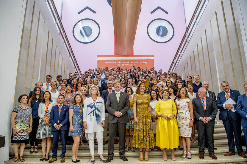 Vergroot afbeeldingKoning Willem-Alexander en Koningin Máxima poseren op de laatste dag van het staatsbezoek aan Italië met alle leden van de handelsmissie.