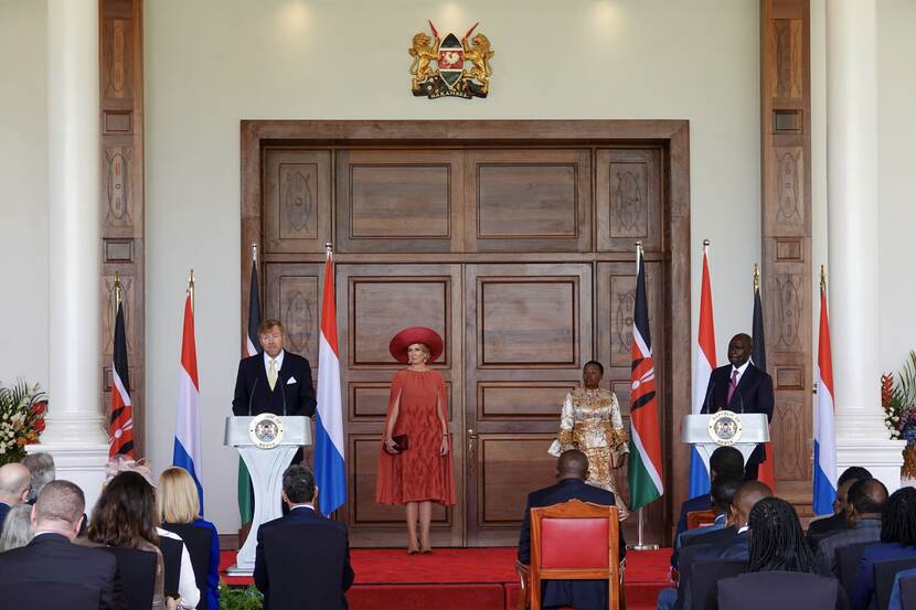 Koning Willem-Alexander en Koningin Máxima en de meereizende Nederlandse ministers gingen in gesprek met de Keniaanse president en zijn ministers. Aansluitend gaven de president en de Koning een korte persverklaring.