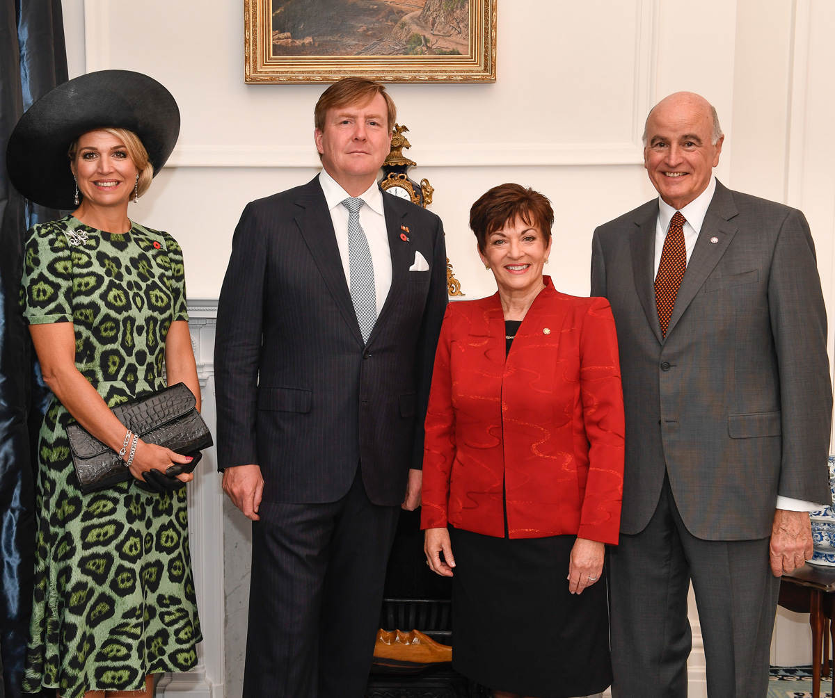 Koning Willem-Alexander en Koningin Máxima spreken in het Government House in Wellington met Gouverneur-generaal Dame Patsy Reddy.