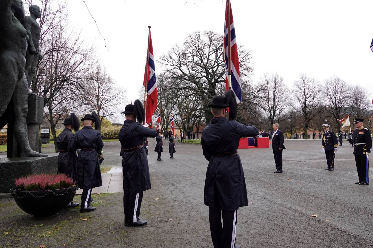 Oslo, 9 november 2021 (staatsbezoek aan Noorwegen): Koning-Willem-Alexander bij het Nationaal Monument in Fort Akershus. De Koning legt hier een krans ter herdenking van de slachtoffers tijdens de Tweede Wereldoorlog in Noorwegen.