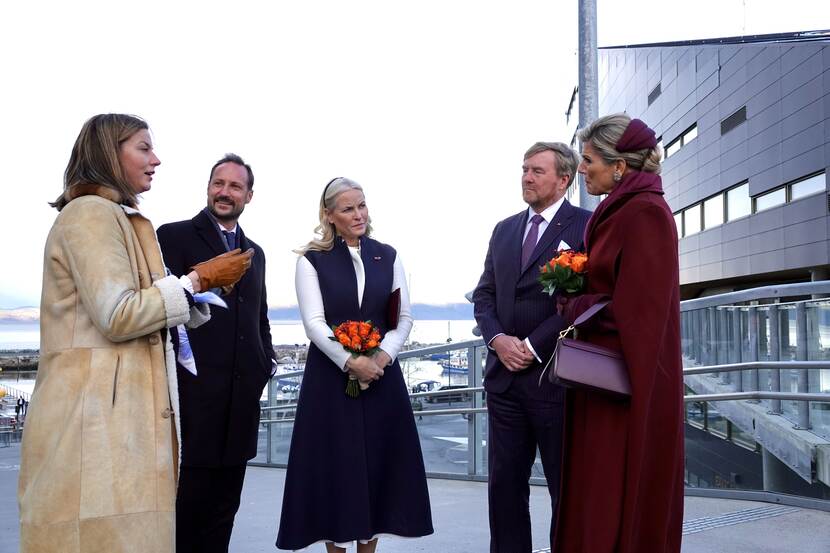 Vergroot afbeeldingKoning Willem-Alexander in gezelschap van het Noors Koninklijk Paar, Koningin Máxima en de Noorse Kroonprinses Mette-Marit tijdens de welkomstceremonie.